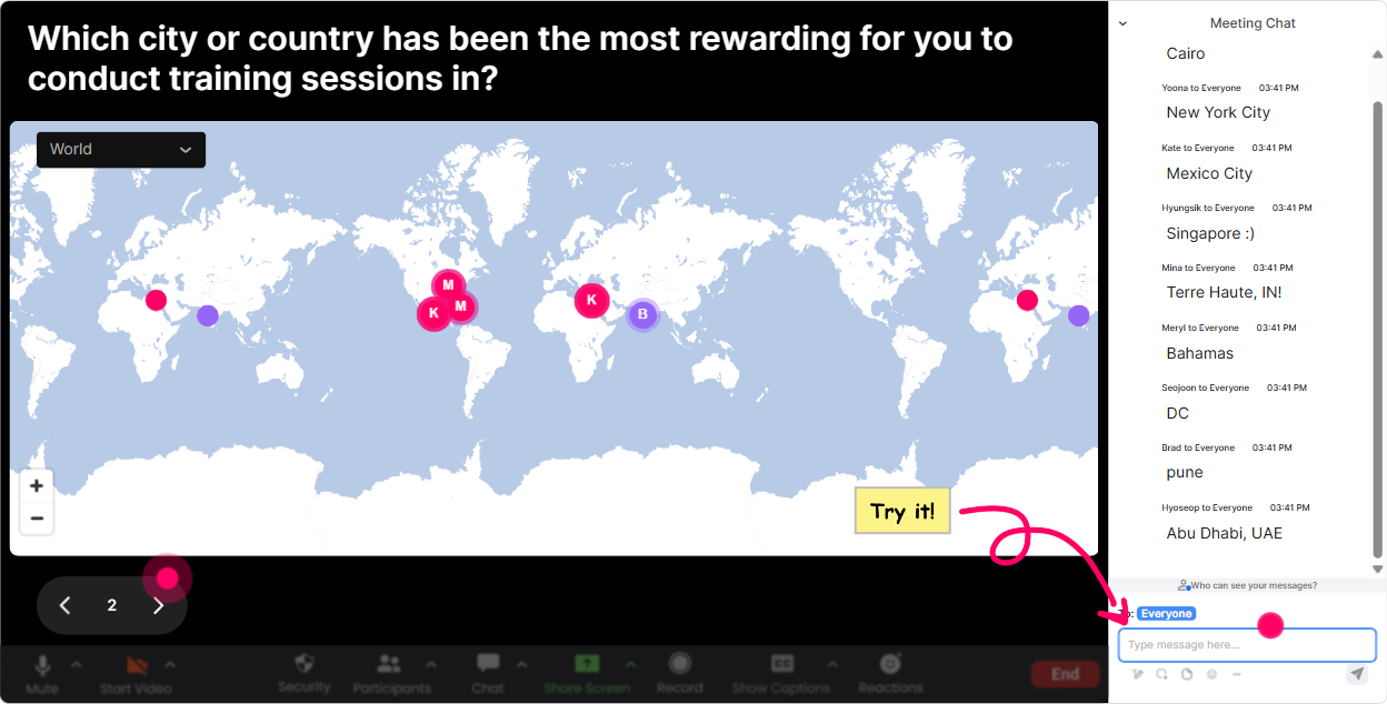 This is the easiest, no-pressure icebreaker that instantly makes the room feel like a community. Instead of asking Where are you joining from? and getting a dead chat, you turn it into something visual and fun-people see themselves show up on the map in real time. Try these Workplace Community-friendly prompts: - Where are you joining from today? (City + country) - Where is your main training audience based-HQ city or region? - If you could build the perfect workplace community anywhere on earth, where would it be? - Which city has the best community vibes in your opinion? Trainer tip: If youre running cohorts across regions, the clusters on the map become an instant talking point: Looks like weve got a strong group from Manila-whats driving community there? Thats an organic discussion starter without you forcing it.